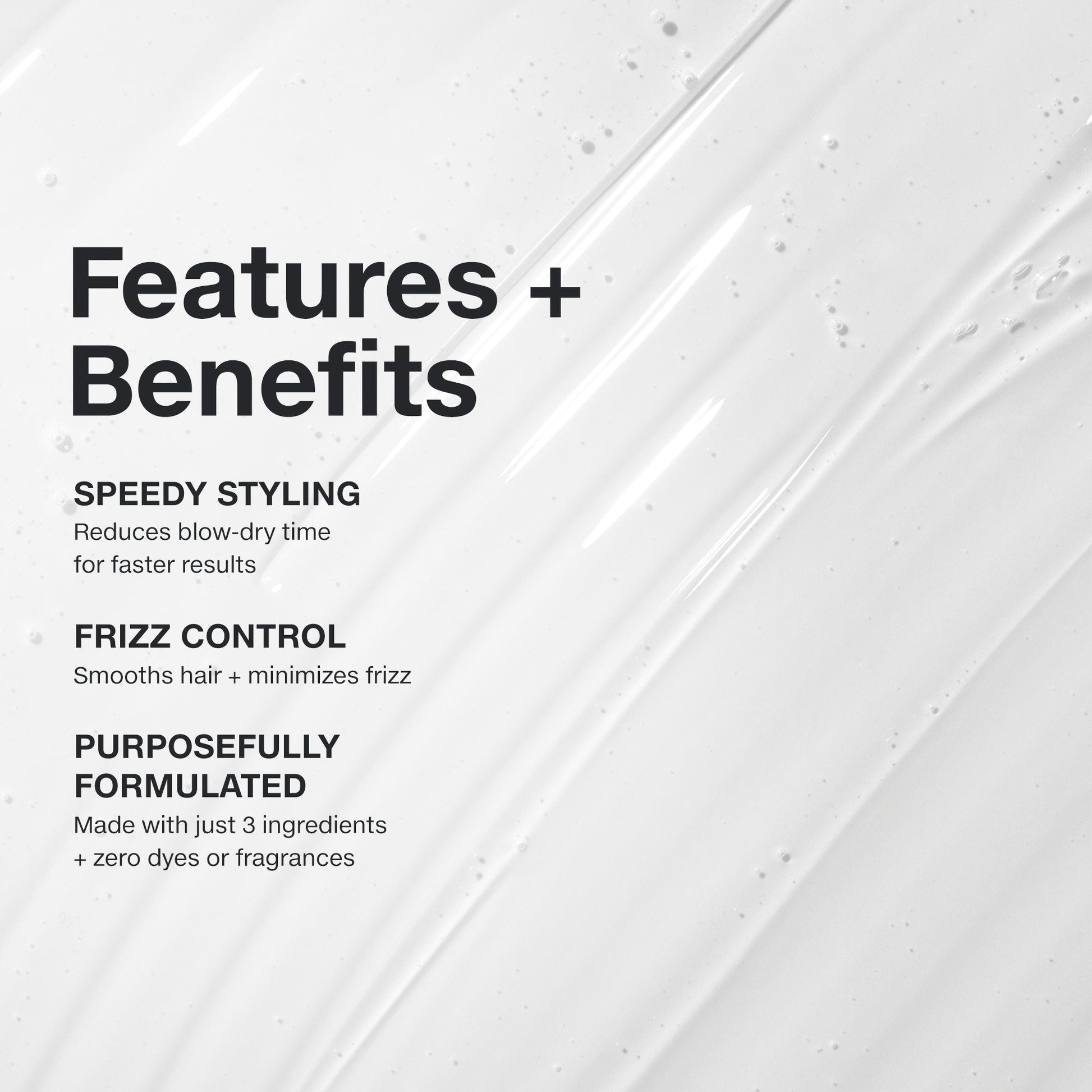 Lightweight blowout primer speeds up drying time for smooth, shiny, frizz-free hair, and is dye-free, fragrance-free and dermatologist tested for sensitive skin.