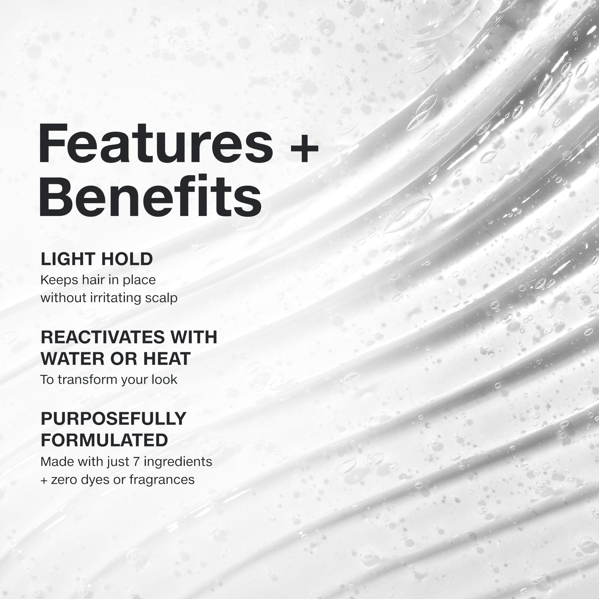 Hair styling glaze delivers soft hold and memory that can be reactivated with water or heat, in a dye-free, fragrance-free formula that’s dermatologist tested for sensitive skin.