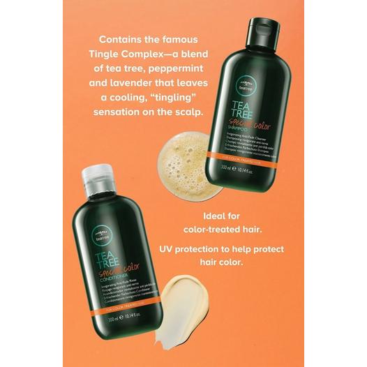 Give your hair a special treatment and experience Tea Tree’s signature tingle in color-protecting formula. Ideal for color-treated hair, this color-safe conditioner tackles tangles for instant manageability, leaving the hair and scalp looking and feeling healthy. It contains unique rooibos tea botanicals and UV protection to help protect hair color from the elements and fading while tea tree and peppermint soothe the scalp and leave hair smelling fresh. Plus, it’s light enough to use daily and great for detangling.